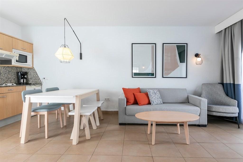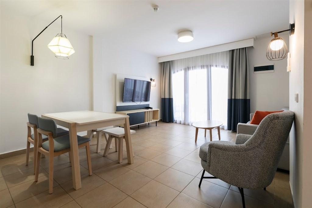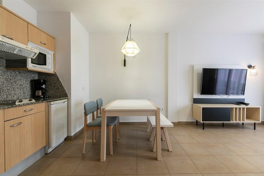 Samostatná dvoulůžková ložnice je od obývací části oddělena dveřmi. Do vybavení patří klimatizace, integrovaný kuchyňský kout (varná deska, mikrovlnná trouba, lednice, toustovač, rychlovarná konvice, kávovar), televize se satelitními programy, bezplatné Wi-Fi připojení k internetu, telefon, trezor (k pronájmu), koupelna s WC, vanou a vysoušečem vlasů, sluneční terasa s lehátky. Maximální obsazenost - 2 dospělé osoby a 2 děti (včetně dětí do 2 let).