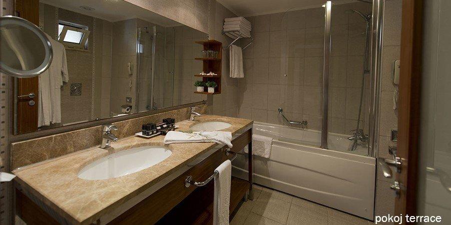 • koupelna, toaleta, fén, klimatizace, TV/sat, telefon, minibar, trezor, balkon nebo terasa