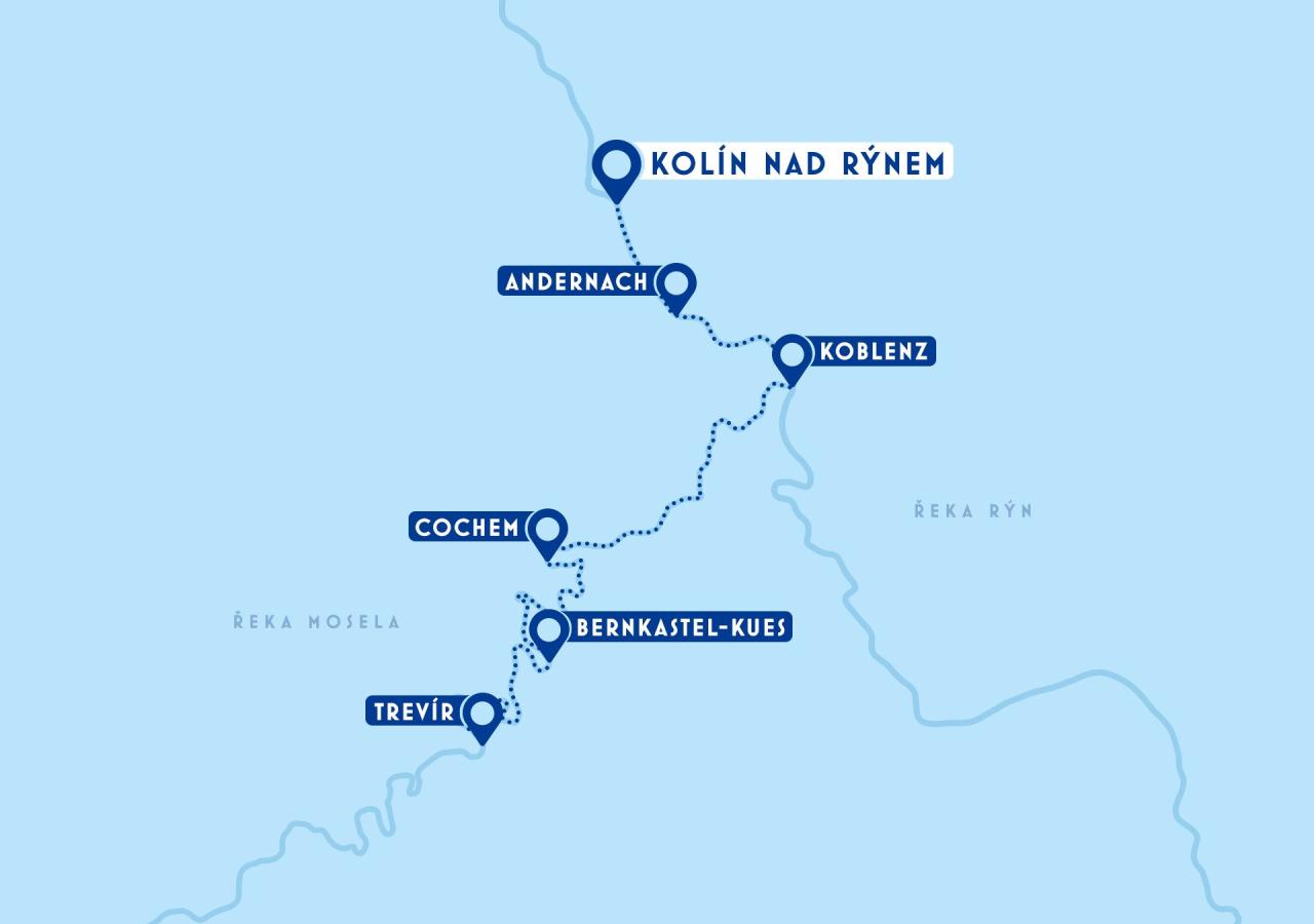 - Kolín nad Rýnem - Cochem - Trevír - Bernkastel-Kues - Koblenz -